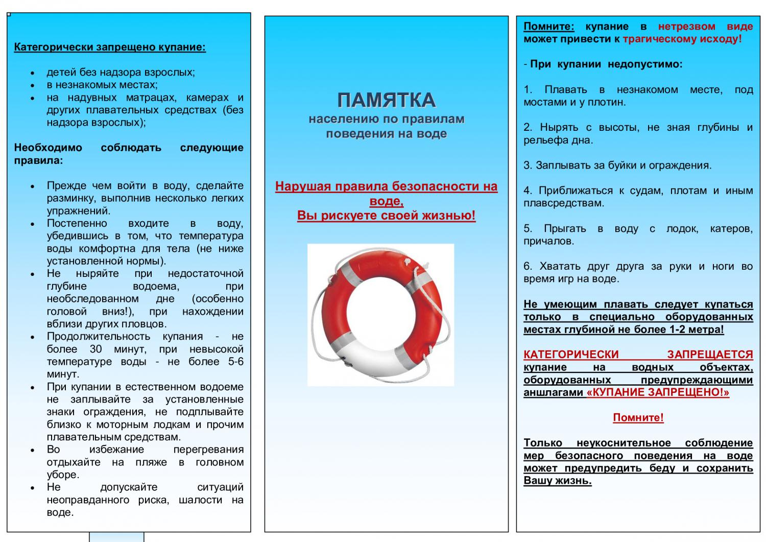 Памятка населению по правилам поведения на воде в летний период !!!