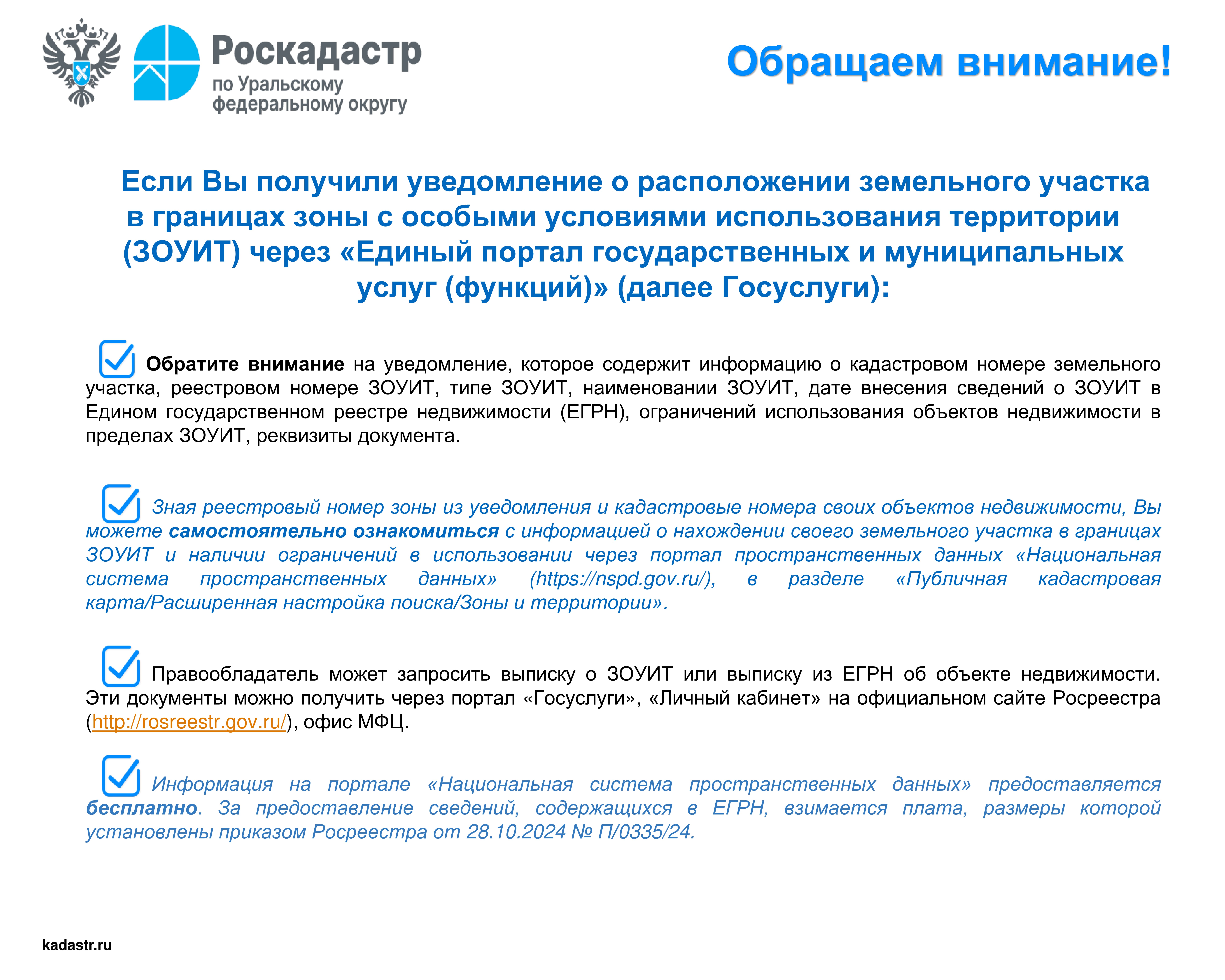 Обращаем внимание! Если Вы получили уведомление о расположении земельного участка в границах зоны с особыми условиями использования территории (ЗОУИТ) через Госуслуги 23 сентября 2025 г. Новости от филиала ППК "Роскадастр" по Уральскому федеральному округу