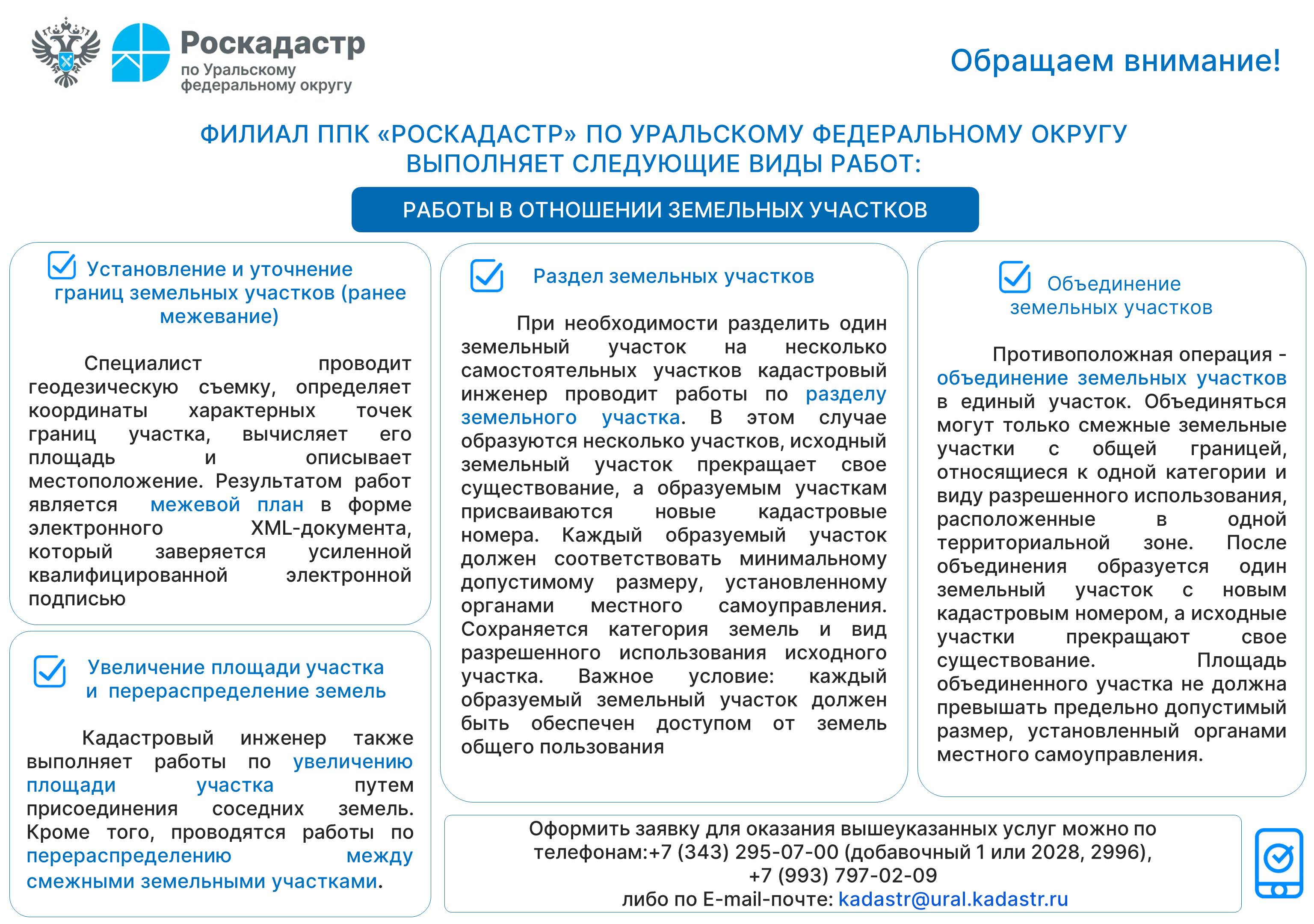 Оформить заявку можно по тел.: +7 (343) 295-07-00 (добавочный 1 или 2028, 2996), +7 (993) 797-02-09 либо по Е-mail-почте: kadastr@ural.kadastr.ru