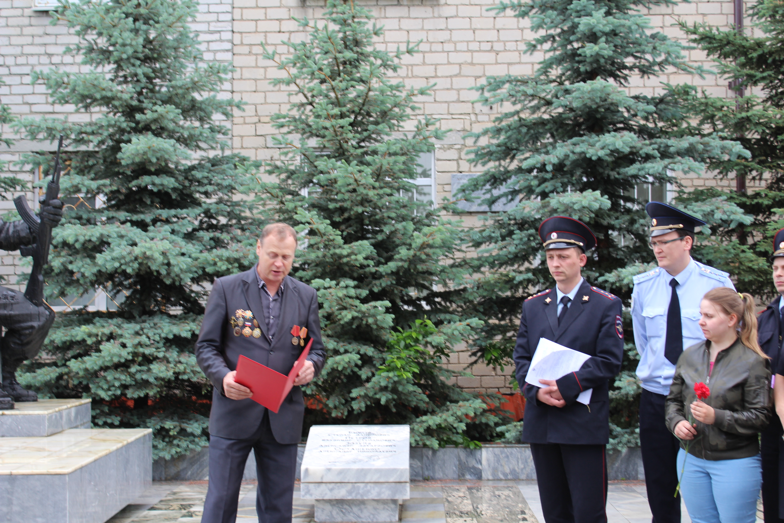 Председатель совета ветеранов Александр Дель открыл митинг словами: «Сегодня мы вспоминаем одну из самых скорбных и трагических дат нашей истории 76 лет назад. 22 июня 1941 года началась Великая Отечественная война. Много бед и страданий принесла она нашему народу, унеся более 26 миллионов жизней. Спустя десятилетия мы скорбим и отдаем дань безмерного уважения и памяти тем, кто прошел все тяготы и лишения Великой Отечественной войны, кто умирал, но не сдавался, кто совершил воинский и трудовой подвиг ради мирного будущего своих потомков. Это была самая страшная и опустошительная война в истории нашей страны, в истории человечества. Годы все дальше и дальше отдаляют нас от тех драматических дней, но память о защитниках Родины, отдавших свою жизнь за свободу, независимость будет жить в наших сердцах вечно. Наш долг - всегда помнить и чтить вечную память погибших, и проявлять неустанную заботу о ветеранах. Сегодня из ветеранов Сысертской милиции в живых остался только один участник Великой Отечественной войны Ульянов Вениамин Иванович и одна труженица тыла Моторина Галина Терентьевна. Но мы помним и тех, кого уже нет рядом с нами. Придя на службу в милицию в 80-х года прошлого столетия, я еще застал многих ветеранов Великой Отечественной войны. Это Коробейников Петр Тимофеевич, Безденежных Александр Николаевич, Старков Федор Николаевич, Константинов Петр Васильевич. Мы молодые сотрудники слушали их воспоминания. Трудно передать словами все тяготы военной жизни, которые им пришлось пережить. И сейчас наша задача не только сохранить наработанный старшими товарищами опыт, но и преумножить его, что бы население с уважением относилось к сотрудникам правопорядка.