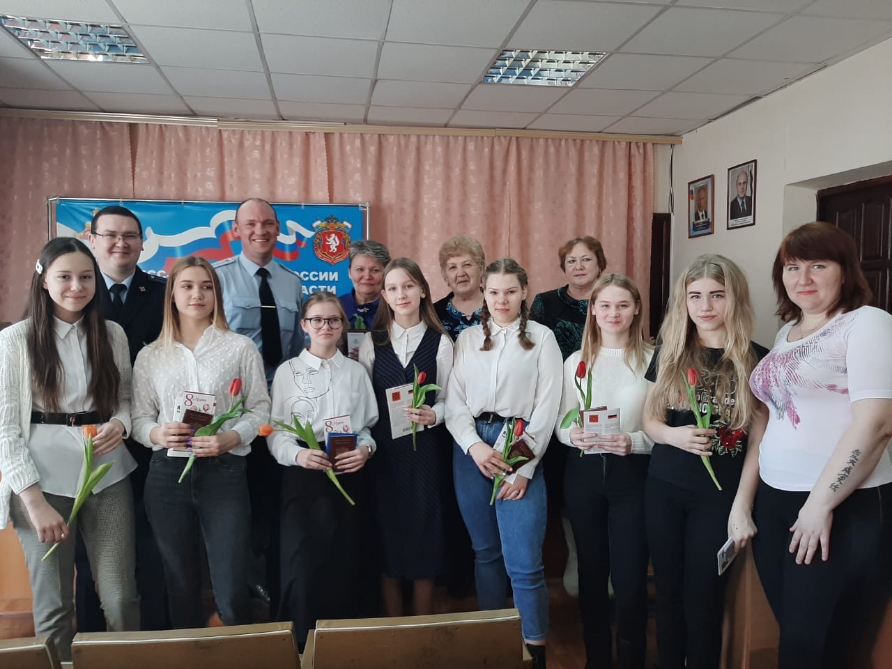 Каждая девушка вместе с паспортом получила цветок и открытку с поздравлениями. В завершении мероприятия мужчины подарили всем присутствующим женщина цветы. После мероприятия состоялось фотографирование. Надеемся, что этот день запомнится молодым девушкам надолго.