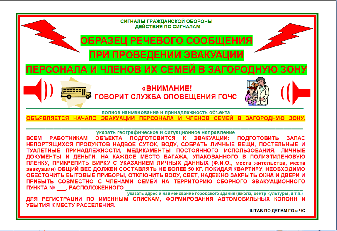Образец речевого сообщения при проведении эвакуации персонала и членов их семей в загородную зону